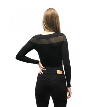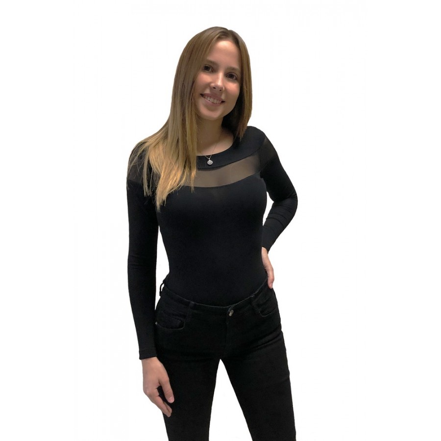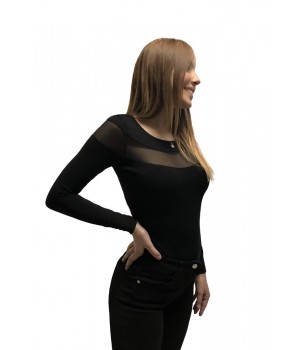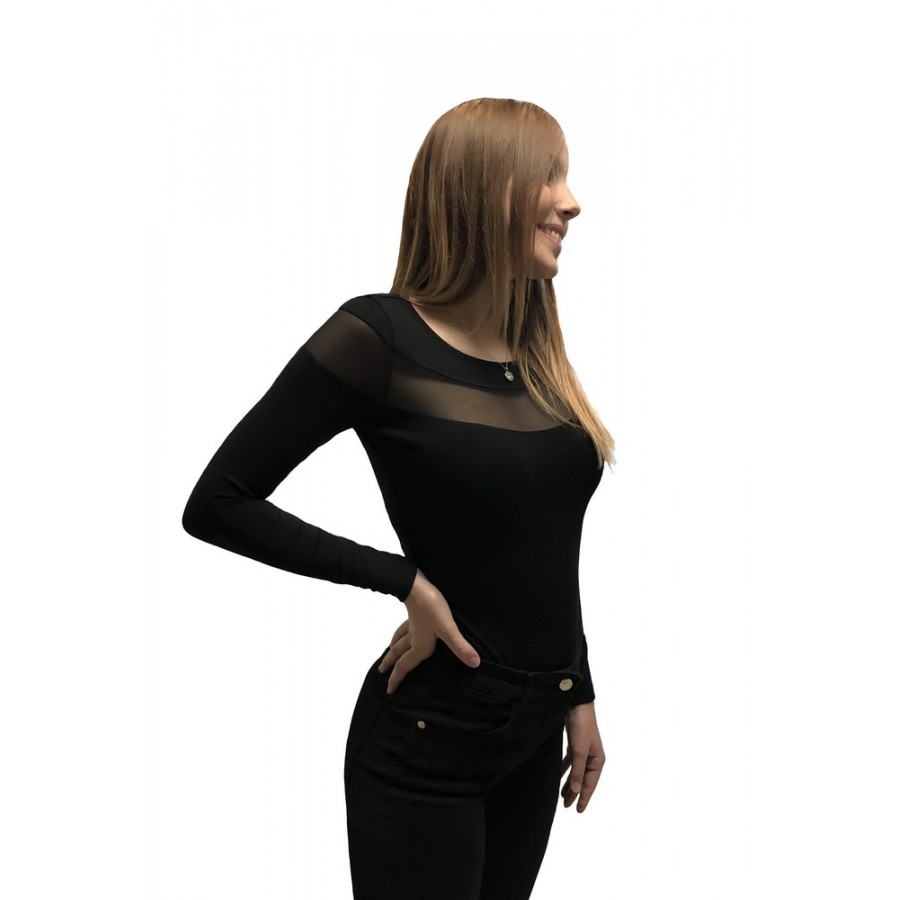 Kerek nyakkivágással, körbeölelő neccel díszített, testre simuló fekete body.. Jól illeszkedik az alakhoz, kellemes viselet. Ideális választás szoknyához és nadrághoz is. Praktikus darab, mely nem hiányozhat a női ruhatárból. Lépésben kapoccsal zárható. A body alsó része klasszikus szabású, de választható tanga kivitelben is, melyet a megrendeléskor a megjegyzés rovatban tüntessen fel.