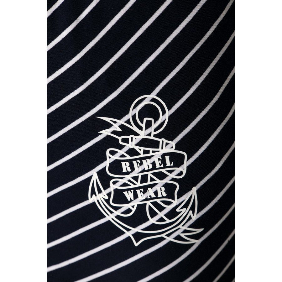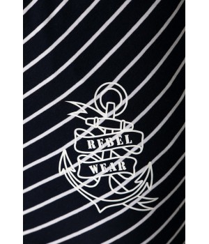 Elasztikus pamutból készült, vállnál kivágott csíkos tunika, horgony mintával díszítve. A csíkok V alakban pozicionáltak, az amúgyis formás alakot még esztétikusabbá varázsolják. Méret választáskor a csípő méretnél javasoljuk a passzentos méret választását, mivel elasztikus anyagból készült, a felső rész bővebbre van kialakítva, így elegánsabb a tunika. Az anyag összetételét tekintve rendkívül strapabíró ruházat. Kiválóan alkalmas a mindennapokra.