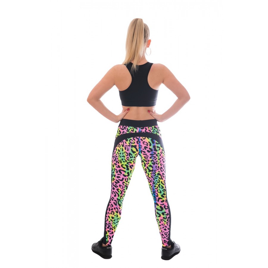 Kényelmes, légáteresztő, elasztikus fitness szett (leggings + sport top), ocelot mintás neon színekkel. A sport top eleje mellrész dupla anyagréteggel készült, az eleje-közepe neccel díszített. Háta egyszínű fekete. A helyes méret választáshoz segítséget nyújt a táblázat. Vedd figyelembe, hogy a gumi 8-10 cm-rel legyen rövidebb, mint a mell alatti testkerület. Ez biztosítja, hogy mozgás közben ne mozduljon el. A leggings hosszanti fekete csíkkal díszített. Gumival erősített a derekánál. Ideális szabadtéri, edzőtermi sportoláshoz, vagy bármilyen szabadidős tevékenységhez.